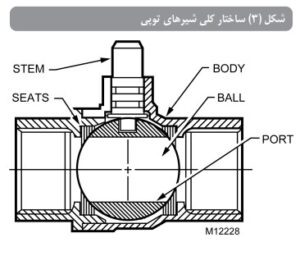 همانطورکه در (شکل 3) نیز مشاهده میشود، شیر کنترل های توپی از یک توپی تشکیل شدهاند که بین دو نشیمن در داخل بدنه شیر کنترل جاسازی شده است. شیر کنترل های توپی با اندازه بدنه مشخص، اندازه های درگاه متعددی دارند و باز و بســته شدن آنها با چرخش 90 درجه ای ساقه شیر کنترل انجام میپذیرد. این نوع شــیر کنترل ها در انواع دو راهه و ســه راهه موجود هستند.