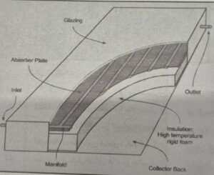 یک کلکتور صفحه تخت خورشیدی معمولاً شامل لوله های مسی است که در یک صفحه جاذب تخت نصب شده اند. معمول ترین حالت لوله های موازی هستند که در هر انتها با دو لوله یکی ورودی و دیگری خروجی به یکدیگر متصل اند (شکل ۵) اجزای کلکتور صفحه تخت در یک جعبه عایق بندی شده نصب گردیده و با شیشه خاصی پوشانده میشوند.کارامدترین طراحی های مربوط به کلکتورها، آنهایی هستند که بهره گرمایی خورشید را به حداکثر و اتلاف دما را به حداقل رسانده و مؤثرترین انتقال حرارت را از صفحة جاذب به لوله های نصب شده انجام دهند. دمای کارکرد این تجهیزات می تواند تا ۱۲۱ بالا رود هر چند که این دما نه معمول است و نه لازم به یاد داشته باشید که شما آب داغ احتیاج دارید، نه بخار.