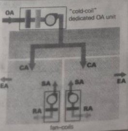 برای نشان دادن چگونگی تأثیر سیستم های تهویه اختصاصی بر انتخاب تجهیزات سیستم سیستم تهویه اختصاصی را در نظر بگیرید. یک سیستم اختصاصی هوای بیرون با پردازش هوای بیرون و تحویل مستقیم هوای مطبوع(CA) به فضا های نیازمند تهویه برآورنده حداقل مقتضیات تهویه می باشد. تامین بار های محسوس محلی در هر یک از فضا ها بر عهده فن کویل های کنترل شونده با ترموستات است.