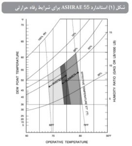 این شــکل از هندبــوک 200 1ASHRAE اســتخراج شده اســت. این شکل نشــان دهنده محدوده های دما و رطوبتی اســت کــه در آن 80 درصد از افراد ساکن در ساختمان در فصل تابستان و زمســتان در حالت بدون تحرک یا با تحرک کم احساس راحتی کنند.