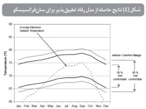 شــکل (3) این مدل تطبیق پذیــر بر مبنای اطلاعات شــرایط آب و هوایی سالانه برای شهر ساکرامنتو ترسیم شده است و نشان دهنده آن است که محدوده رفاه دمای داخل در طول سال چگونه تغییر میکند. این نمودار همچنین متوسط حداکثر دمای روزانه را برای هر ماه مشخص میکند و بدین ترتیب تصویر کلی از فصولی را نمایش میدهد که امکان استفاده از تهویه طبیعی برای تامین شرایط رفاه انسانی وجود دارد.